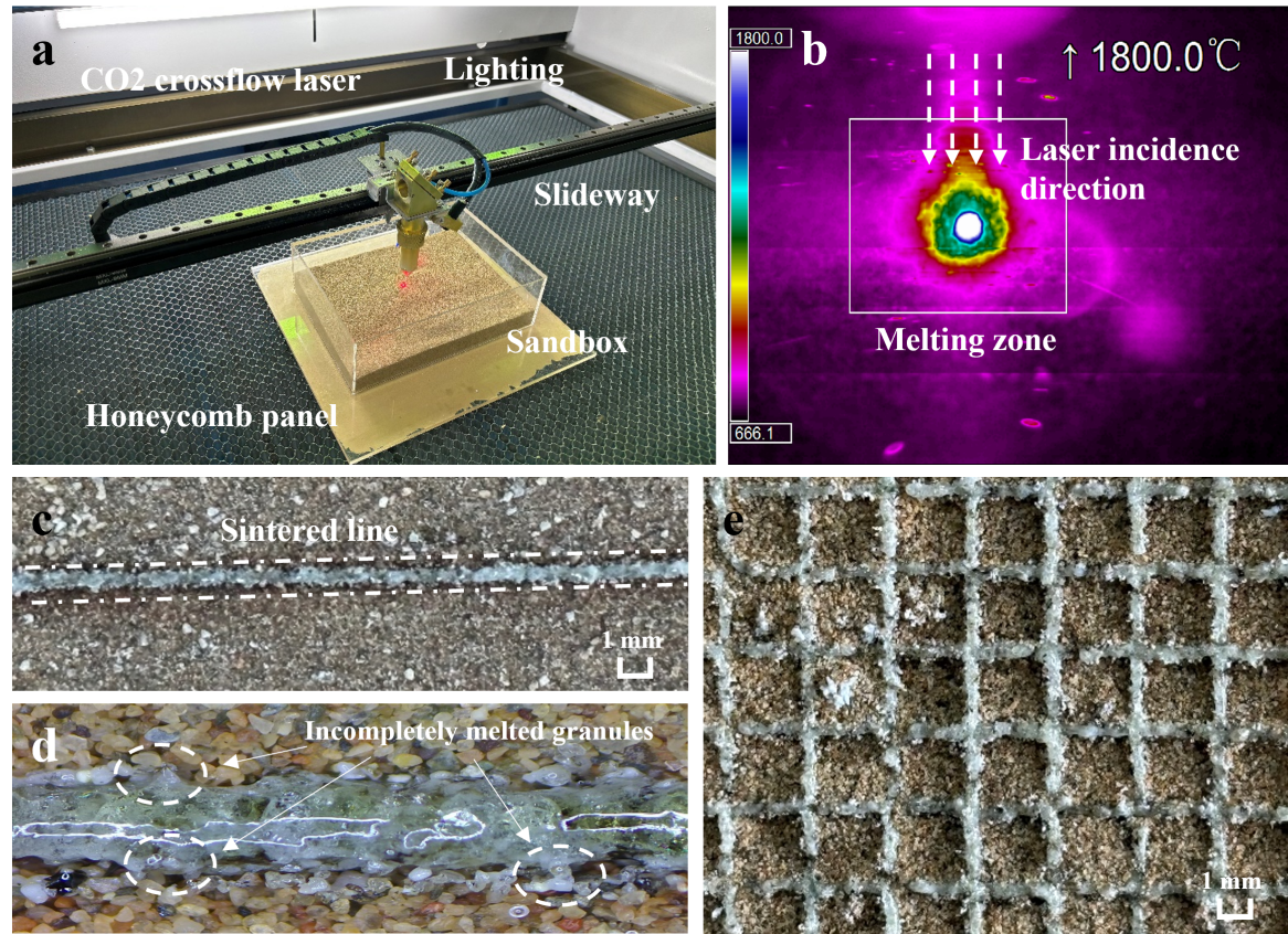 这项技术的核心创新在于"以沙治沙"的绿色理念。与传统草方格需要消耗大量秸秆、依赖人工铺设不同,无人机激光固沙直接利用沙漠中丰富的硅砂资源,通过10.6μm波长的CO₂激光烧结,使沙粒表面形成稳定网格结构。激光照射时产生的1800℃以上高温,能让硅砂中的二氧化硅及低熔点杂质融化,冷却后形成类似"根系"的凸起结构,牢牢嵌入沙层深处,在8-10级风力下仍能有效阻挡风沙流动。